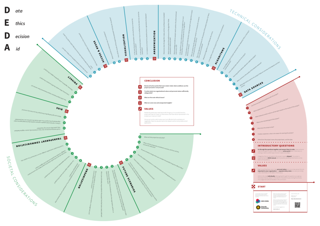 The DEDA tool consists of a large A0-sized poster and a user guide. DEDA facilitates deliberative discussions among interdisciplinary teams, stakeholders, and project managers regarding data and AI projects. The tool helps teams walk through the various phases of a project and address the various ethical issues that may arise. The poster is designed for hands-on use and invites teams to write comments on post-it notes and stick them onto the poster. You can download the latest version of the poster below.